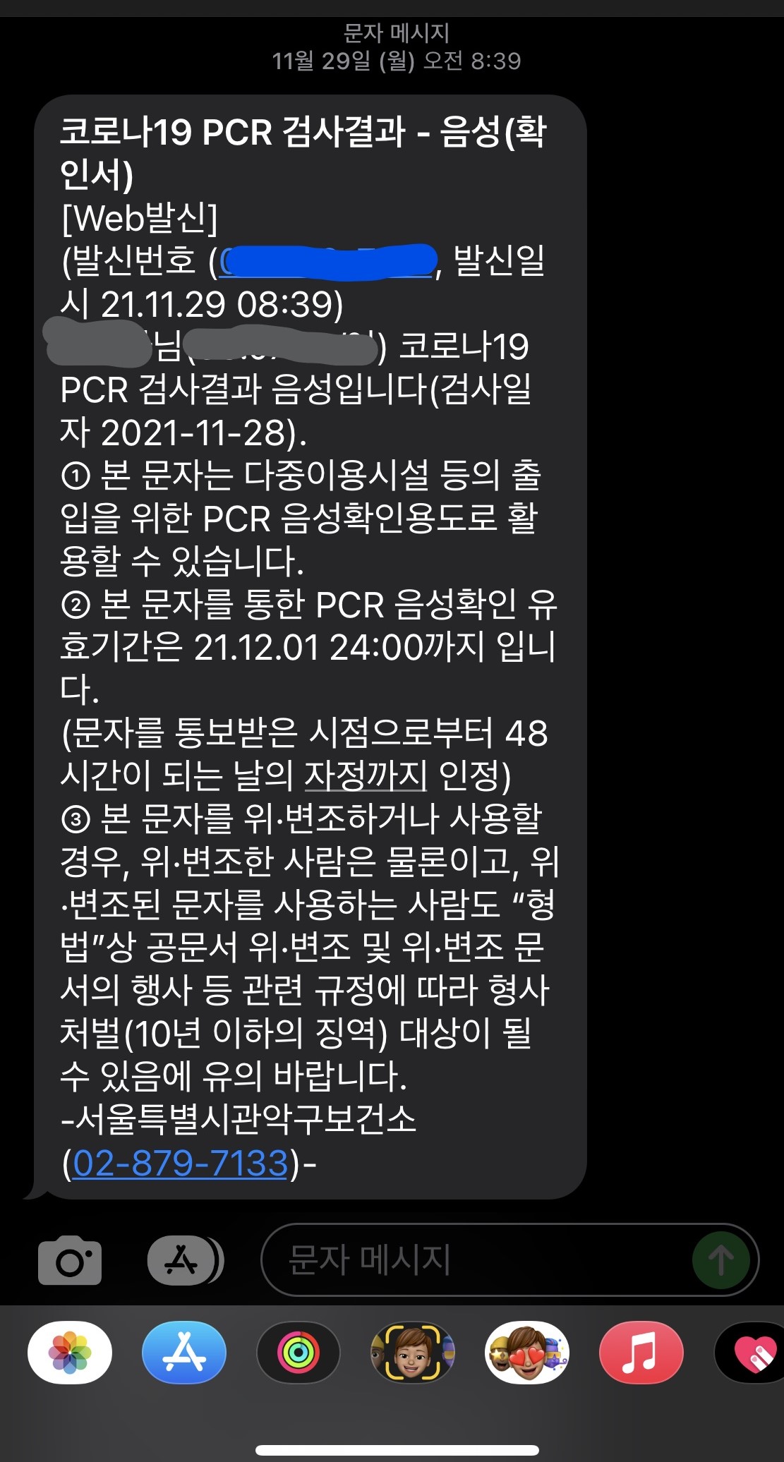 8시 40분 정도에 보건소에서 기다리던 코로나 검사결과 안내문자가 왔다.