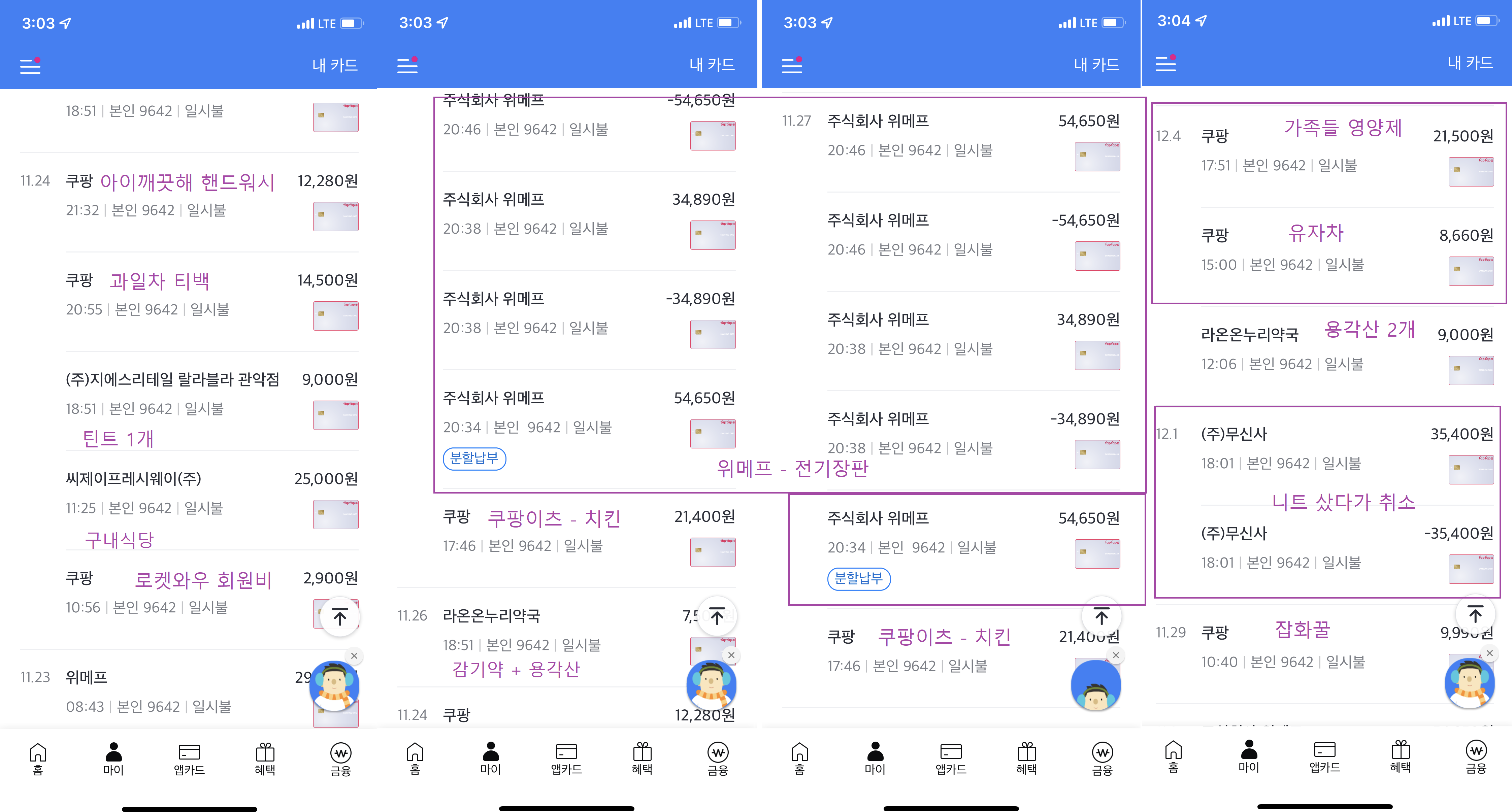 13일 동안의 카드내역이 스크린샷 4장에 담기더라.