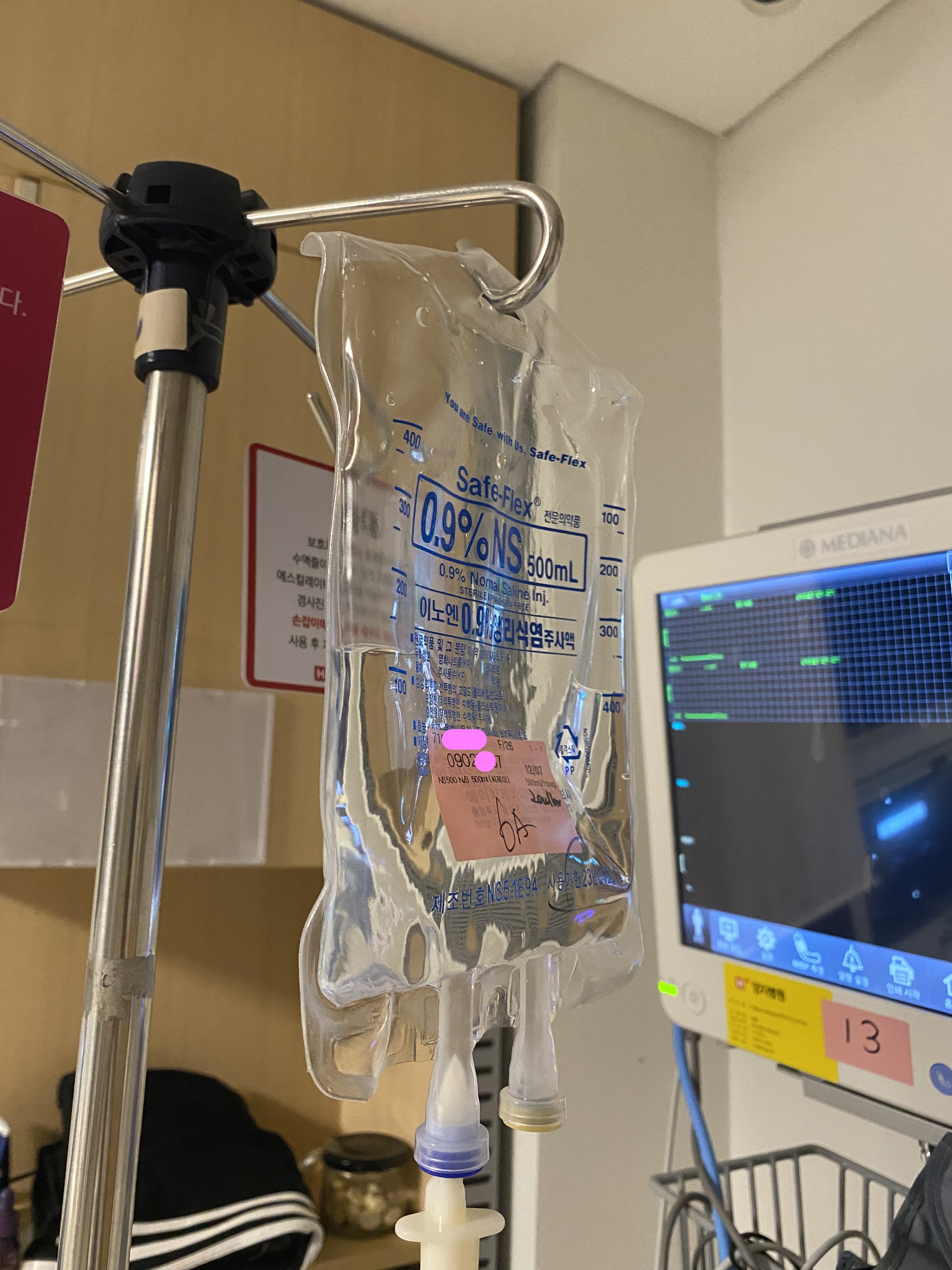 - 나는 입원 2일째에도 38도까지 열이 높아서 생리식염수 수액을 추가로 맞았다.