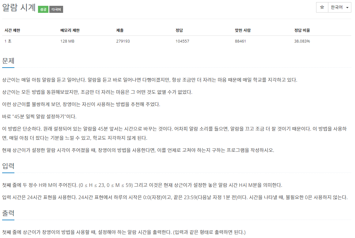 [baekjoon][Java] 2884번 - 알람 시계 본문