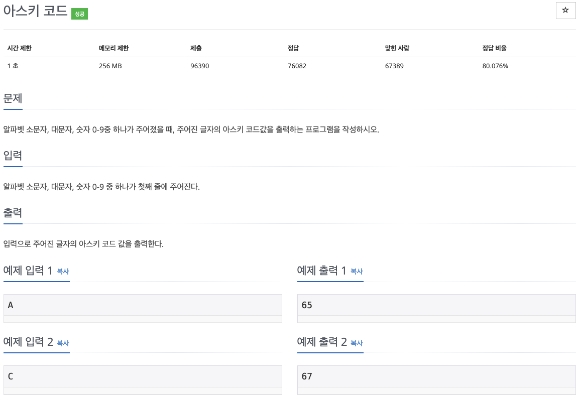 [baekjoon][Java] 11654번 - 아스키 코드 본문