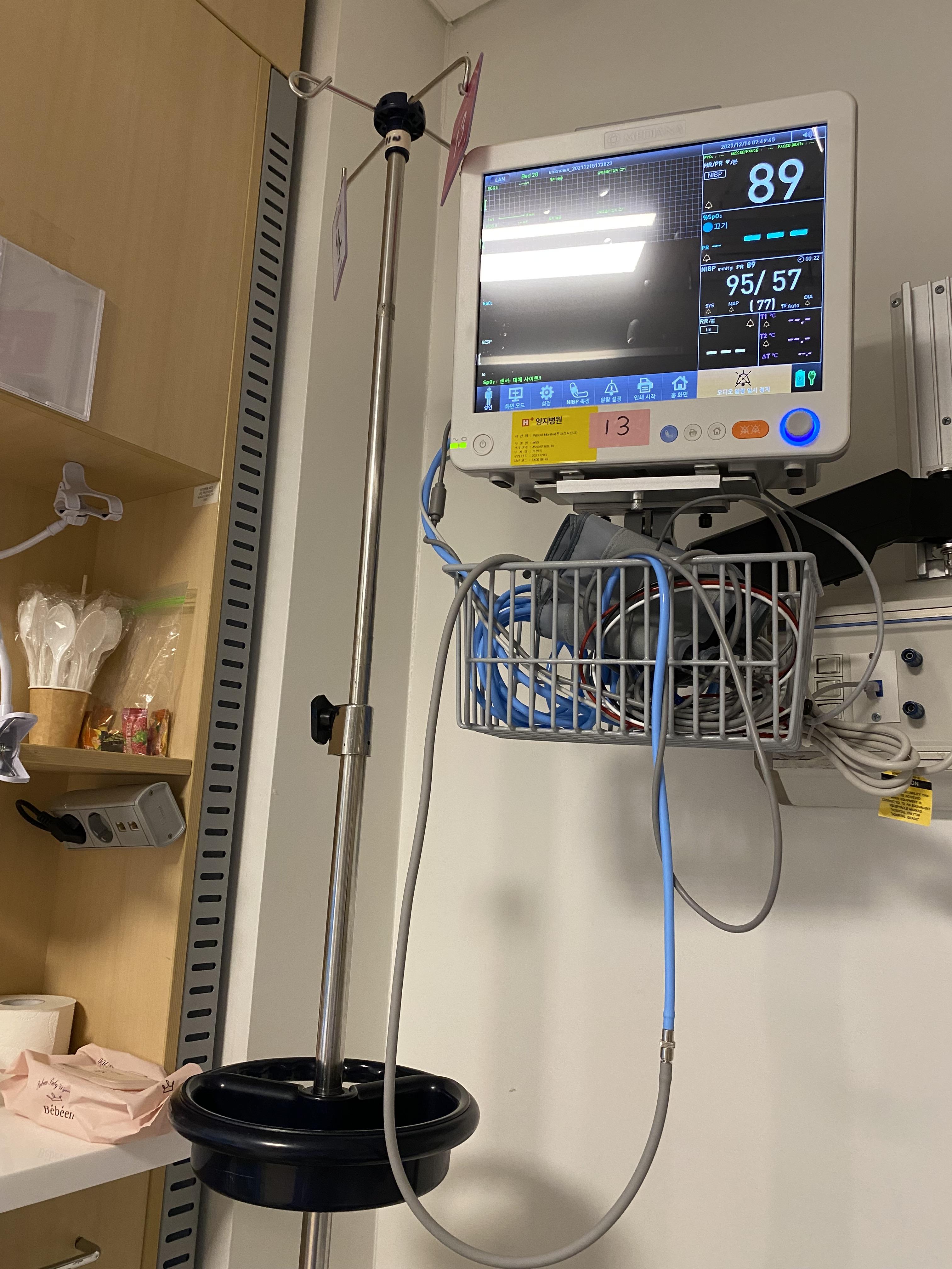 주사 바늘 한 개에 심염수 수액을 연결한 채로 잠이 들었는데, 갑자기 수액 맞는 팔이 저리고 아파왔다. 급하게 간호사실에 문자를 보냈고 간호사 선생님이 찾아와주셨다.