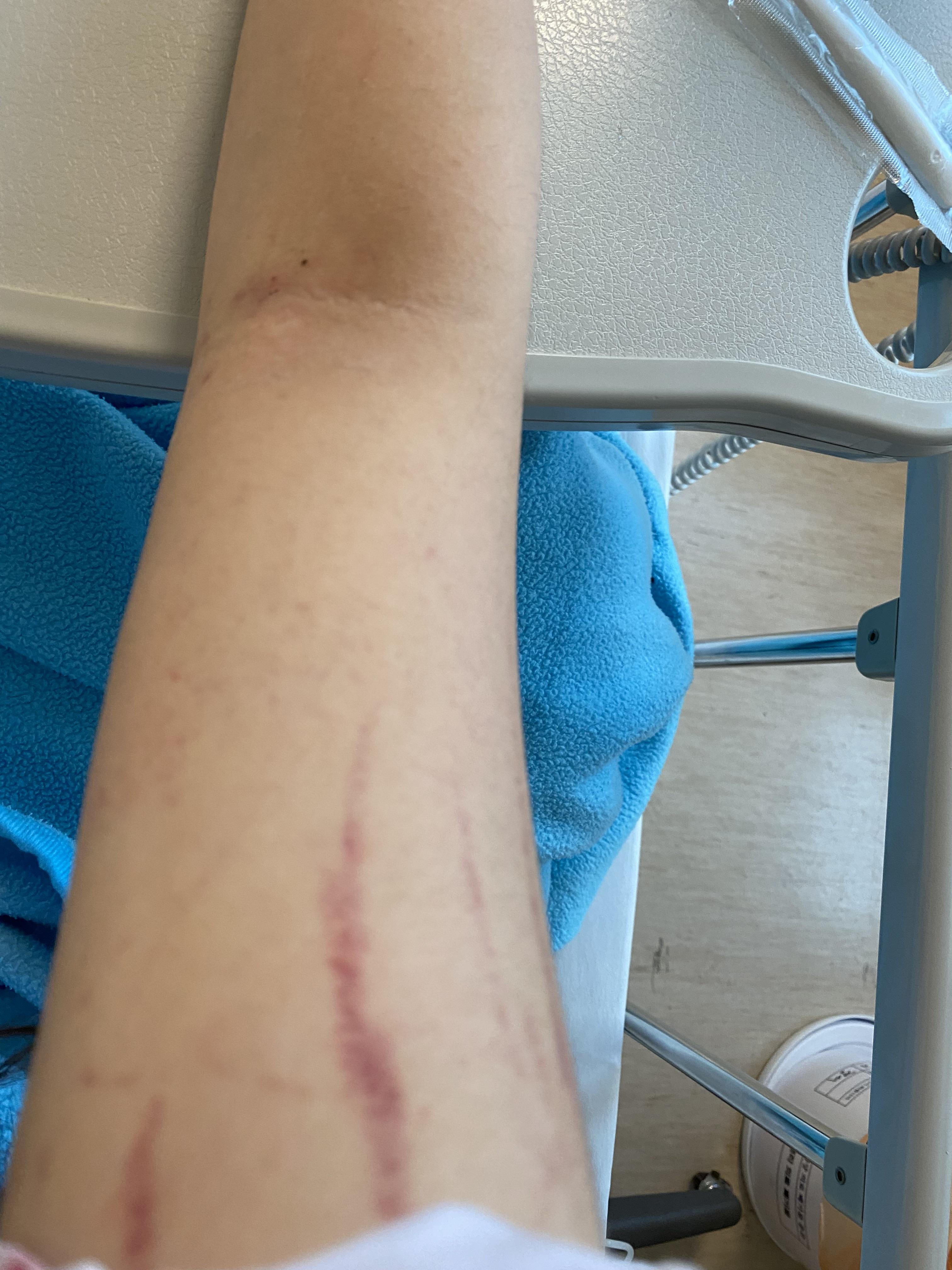 원래도 혈관이 약한데 여기 병원의 혈압측정기가 특히 강력했는지, 입원 첫날에 혈압 2번 측정한 팔의 모습이다.